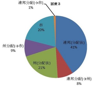 連邦は、約5分の1の連邦収入を州または市へ分配しています。この分配は殆どが市ではなく州へと渡りますが、連邦から州への分配は、その殆どが州から市へと配布されます。市の収入は、それらの分配を含むと、政府全体の収入の約30%を占めることになります(図表3)。